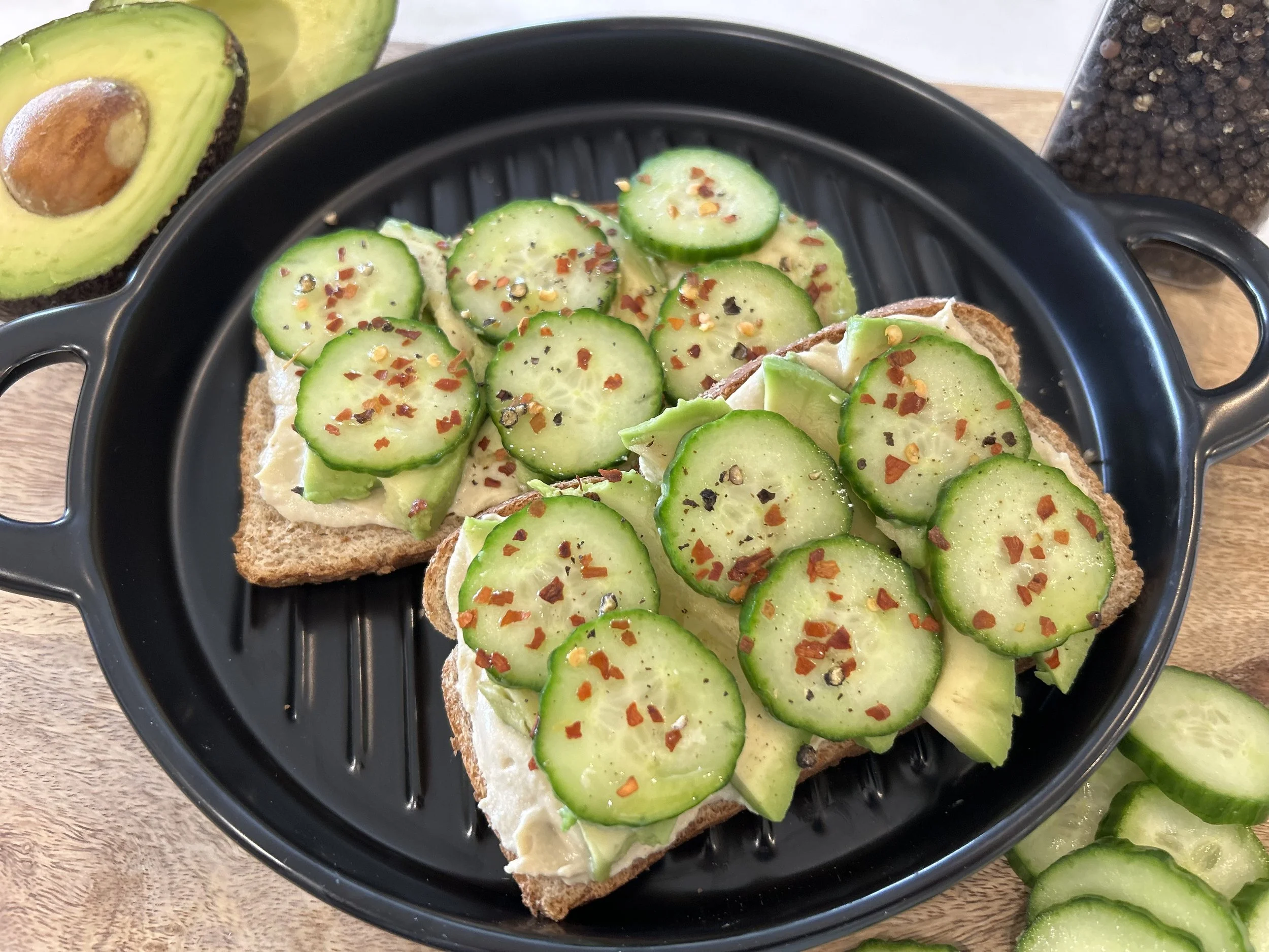 - Spread hummus on toast and top with avocado and cucumber slices.