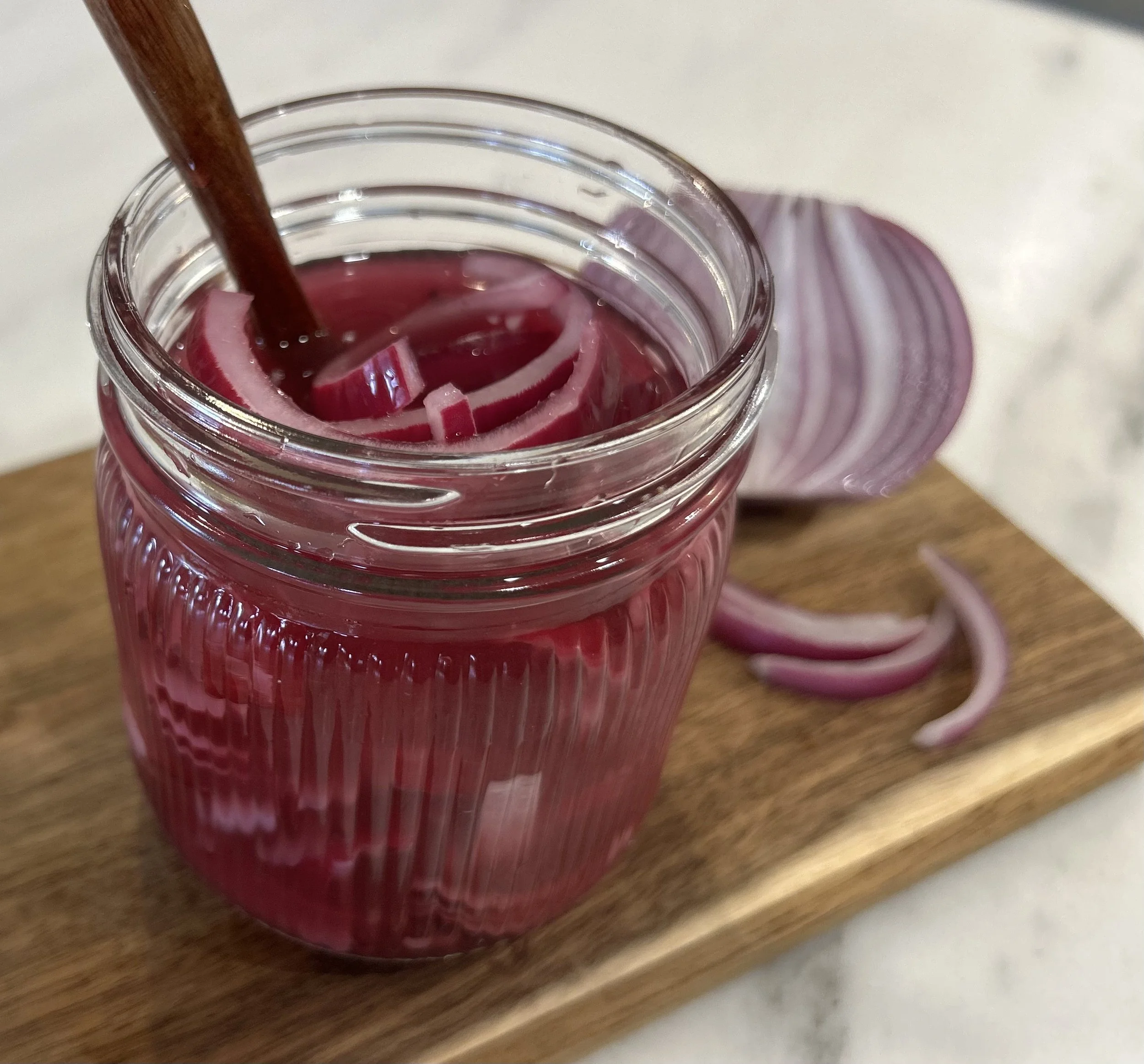 - Thinly slice the onion (mandoline is the best for uniformly thin slices, but I'm often lazy and go the knife route!) t. The thinner the onion slices the quicker the onions will pickle!