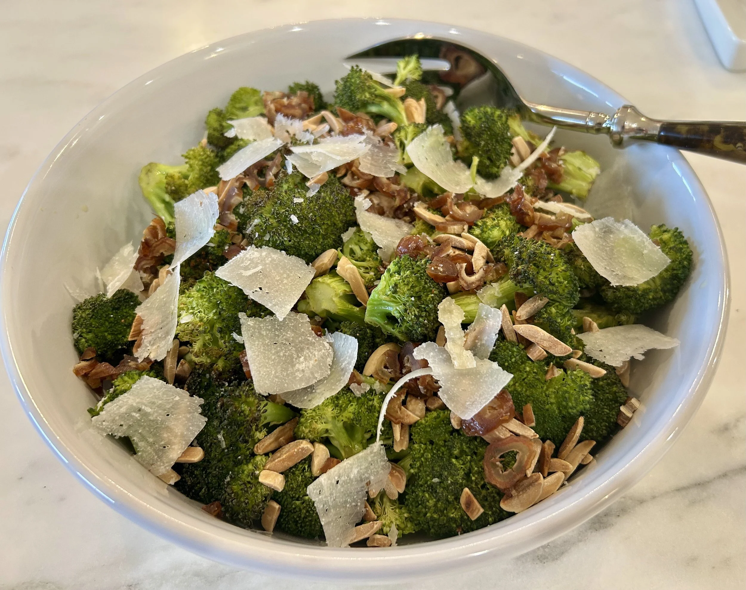 - Place roasted broccoli in a serving bowl and add the dressing, almonds and chopped dates and toss. Top with shaved parmesan cheese and flakey sea salt.